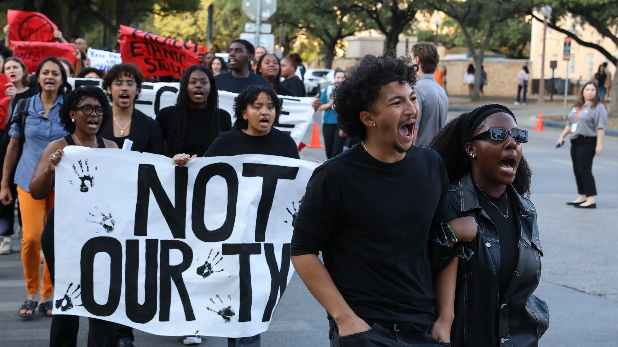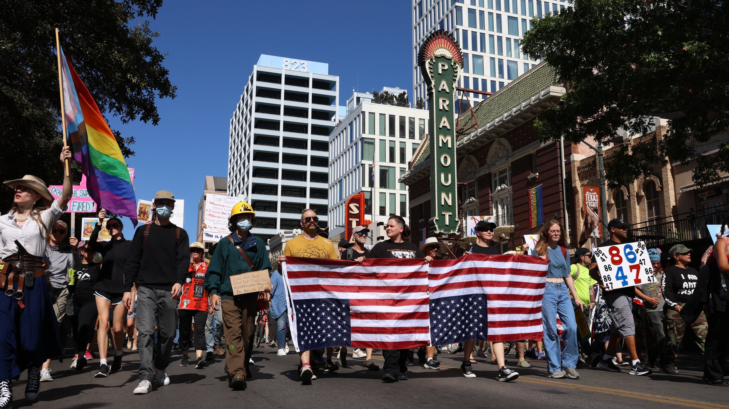 Protesters walk down South Congress during the Austin No Kings protest Oct. 18. Estimates say between 20,000 and 30,000 protesters took to Austin streets among millions nationwide.