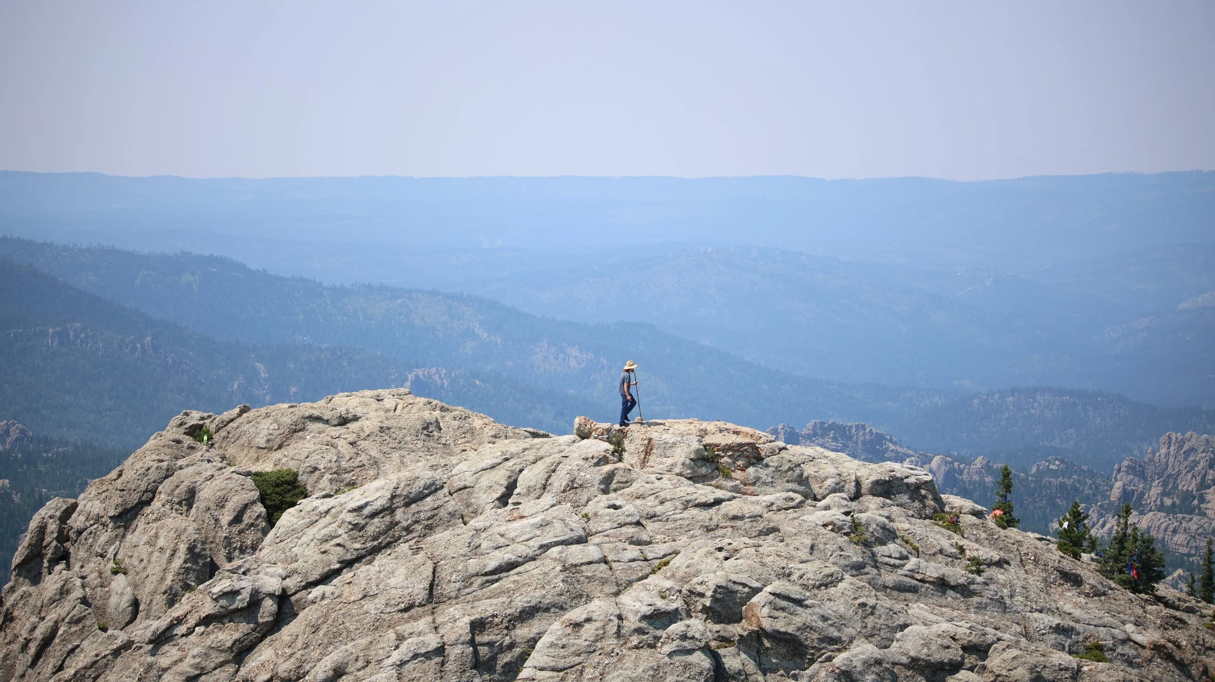 A man hikes atop Black Elk Peak overlooking Custer State Park in western South Dakota.